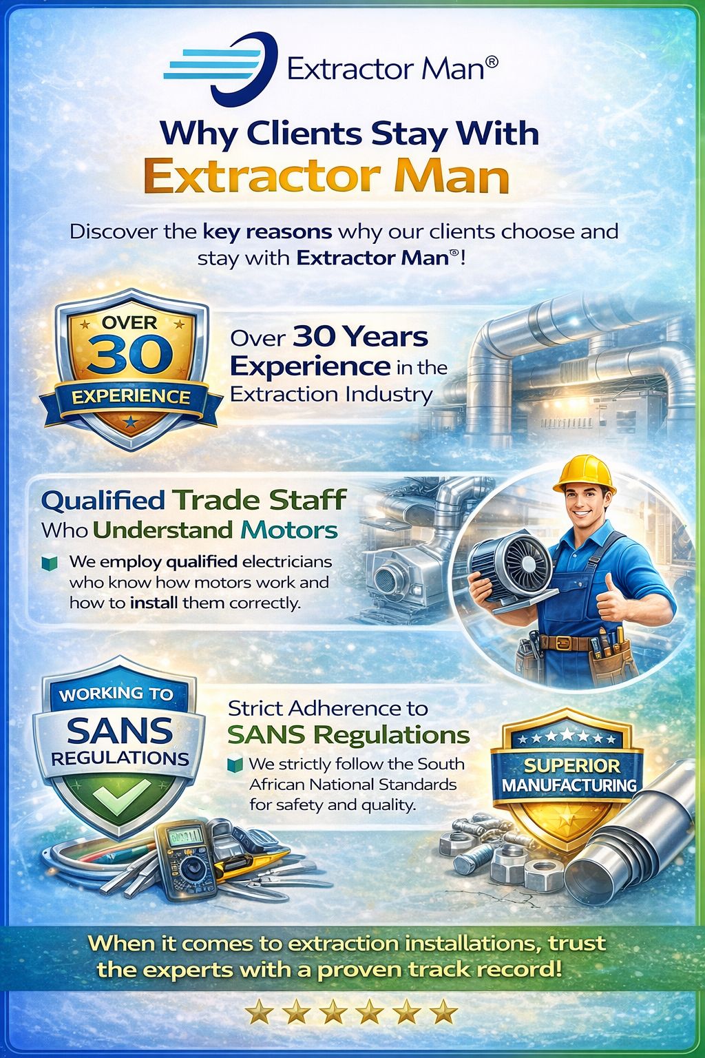 We have all the qualification including engineering and electrical (Electrician) to do any work required on your extractor systems.